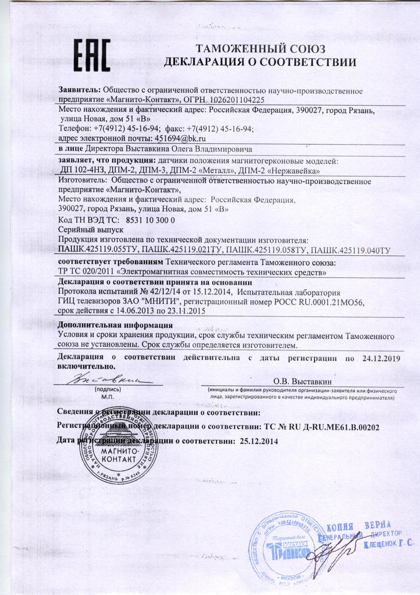Датчики положения магнитогерконовые ДПМ-2, предназначены для блокировки ворот, железнодорожных контейнеров, ангаров, дверей вагонов, лифтов и других конструктивных элементов зданий и сооружений из магнитопроводных материалов (сталь, чугун, оцинкованное железо и т.д.) и немагнитопроводных материалов, на открывание или смещение с выдачей сигнала путем размыкания (переключения) сухого контакта геркона, а также в системах автоматики различных устройств.
