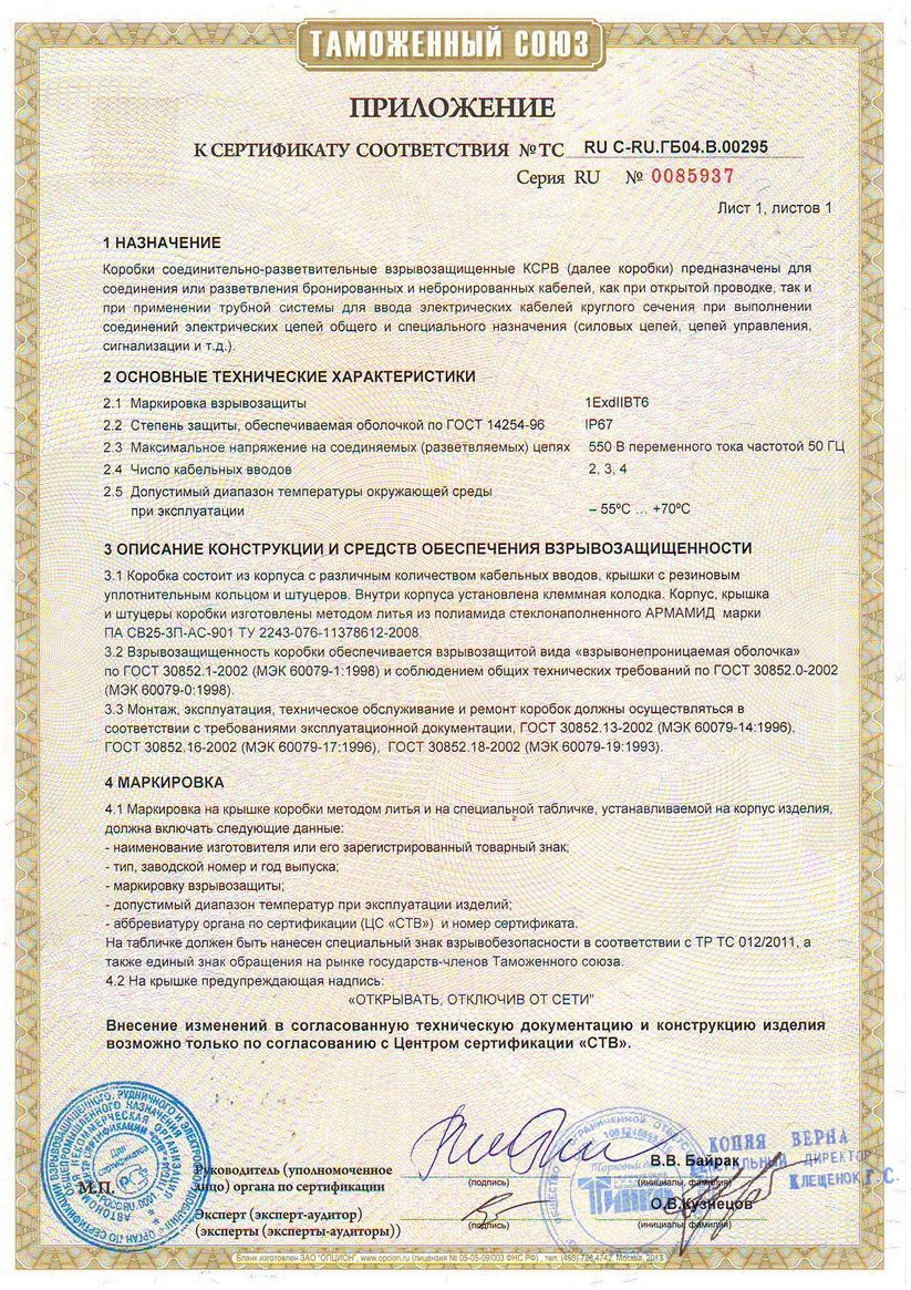 Взрывозащищенность коробок обеспечивается видом взрывозащиты «взрывонепроницаемая оболочка d по ГОСТ Р 51330.1, маркировка взрывозащиты 1ExdIIBT6 по ГОСТ Р 51330.0.