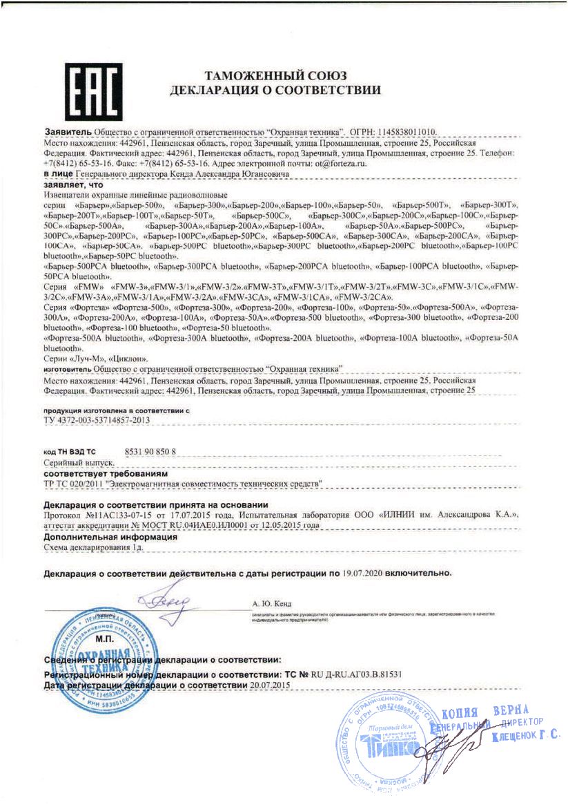 Извещатели охранные радиоволновые линейные двухпозиционные, длина ЗО 10...100м, ширина ЗО — 5м, высота ЗО — 1,8м; U-пит.9...30В, I-потр.35мА, t-раб.-40...+65°С, 211х135х75мм. Синхр.прием. и перед., синхр.с соседним участком.