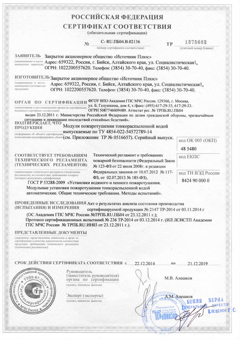 - Модули пожаротушения тонкораспыленной водой