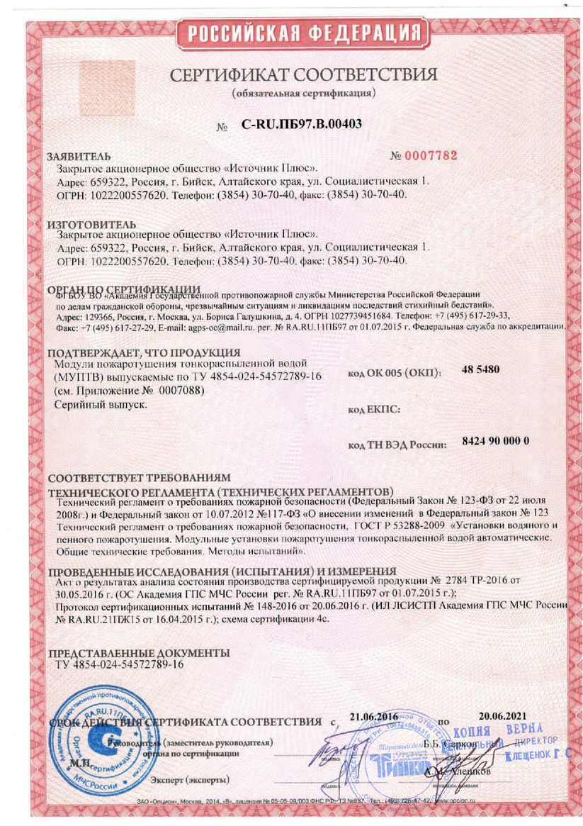 - Модули пожаротушения тонкораспыленной водой