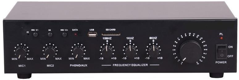 Настольный усилитель со встроенным модулем MP3 (USB/SD-карт), 60Вт. FM-тюнер, ИК-пульт управления, 2 микрофонных входа;  выход: 100В / 4Ом/8Ом/16Ом;  220В/50Гц;  320x190x80 мм; Вес: 5 кг.