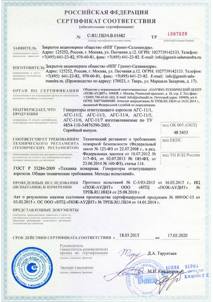 Предназначен для генерирования газоаэрозольной смеси в концентрации, необходимой для остановки процесса пламенного горения.