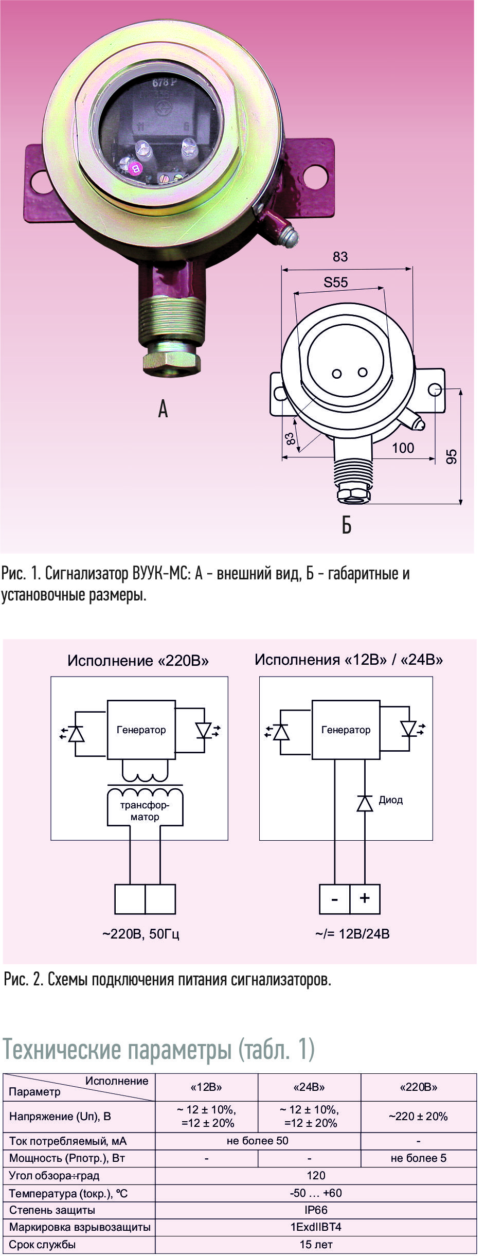 Корпус сигнализаторов выполнен из стали, имеет гальваническое антикоррозионное и защитное лакокрасочное покрытие. На съемной крышке имеется прозрачное смотровое окно. В корпусе установлена электронная плата, на которой располагаются два ярких светодиода. Питающий кабель - круглого сечения, с диаметром по изоляции 5 ...12 мм (уплотняется в кабельном вводе).