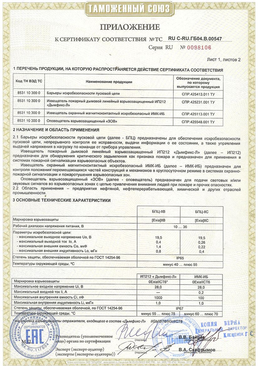 Оповещатель имеет взрывозащиту видов «герметизация компаундом (m)» и «искробезопасная электрическая цепь (i)», маркировку взрывозащиты «1ExibmIIBT6» и предназначен для установки во взрывоопасных зонах класса 1 и ниже по ГОСТ 30852.9. Питание оповещателя осуществляется от обычной (неискробезопасной) цепи.