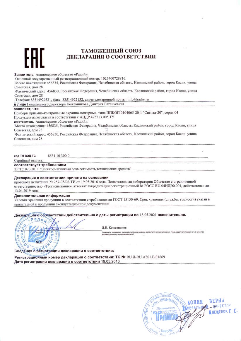 Прибор приемно-контрольный охранно-пожарный ППКОП 0104065-20-1 "Сигнал-20" серия 04 АЦДР.425513.005 ТУ предназначен для централизованной и автономной охраны магазинов, касс, банков, аптек, учреждений, предприятий и других объектов от несанкционированных проникновений и пожаров путем контроля состояния двадцати шлейфов сигнализации, с включенными в них охранными, пожарными и охранно-пожарными извещателями, и выдачи тревожных извещений о нарушении ШС и срабатывании извещателей на индикаторы и сигнализатор прибора, а также по интерфейсу RS-485 оператору на пульт контроля и управления "С2000" или компьютер, дежурному на пульт централизованного наблюдения через три релейных выхода. Прибор обеспечивает также включение на объекте цепей управления внешними звуковыми и световыми оповещателями, сигнализаторами и указателями.