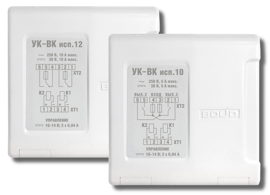 Устройство коммутационное УК-ВК в системах охранной сигнализации и контроля доступом предназначено для коммутации исполнительных устройств (ламп, сирен, видеокамер, электромагнитных замков и т.д.) в сети переменного тока номинальным напряжением 220 В или в цепях постоянного тока до 30 В путём замыкания, размыкания и переключения контактов реле. В системах пожарной сигнализации устройство предназначен для передачи стартового импульса на прибор пожарный управления.