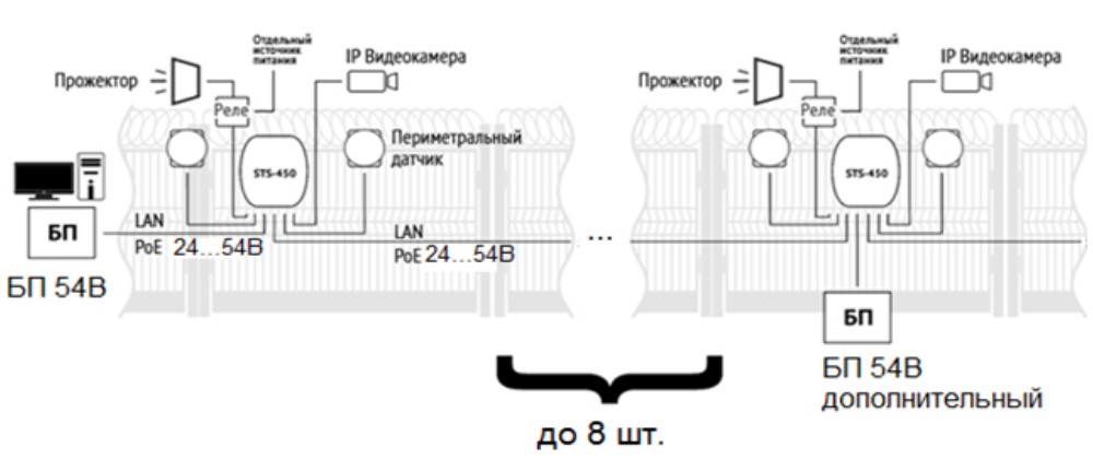 Контроллеры объединяются последовательно в цепочку, что позволяет решать задачу увеличения сегмента охраны периметра.
