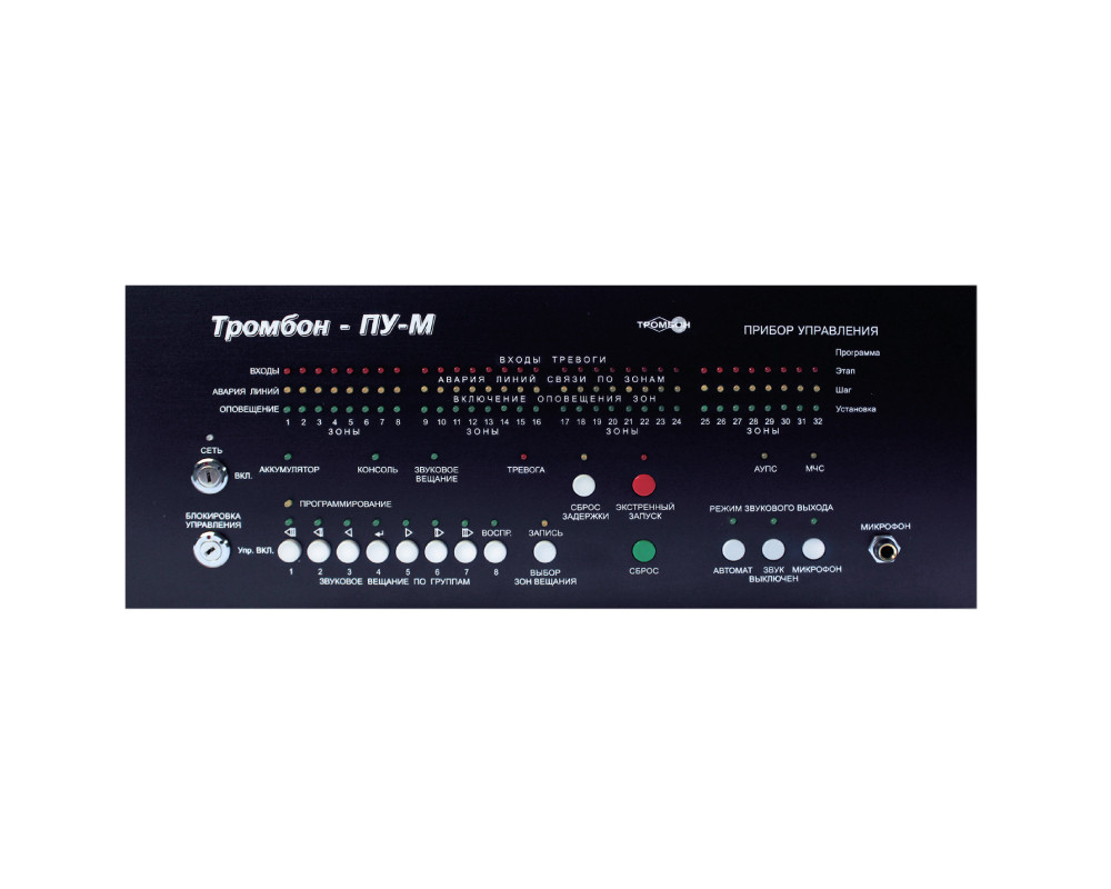 Прибор управления техническими средствами оповещения и эвакуации «Тромбон - ПУ-М» (далее в тексте – Прибор или Прибор управления) предназначен для построения системы оповещения и управления эвакуацией (СОУЭ) 1, 2, 3, 4 и 5 типов на различных объектах с количеством зон оповещения – до 8.
