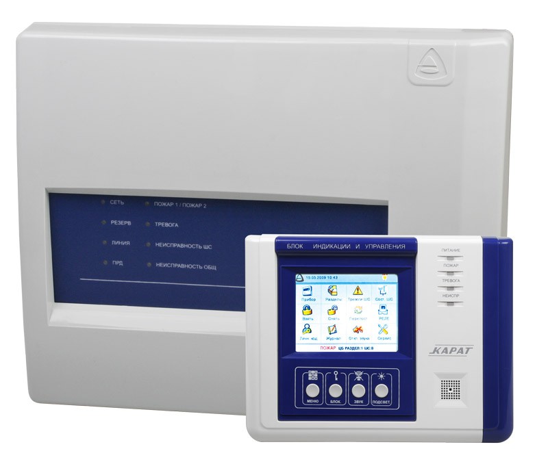 В состав прибора «КАРАТ» входят центральный блок, выносной сенсорный блок индикации и управления и адресные модемы для обеспечения связи между ЦБ и БИУ по адресной двухпроводной линии.