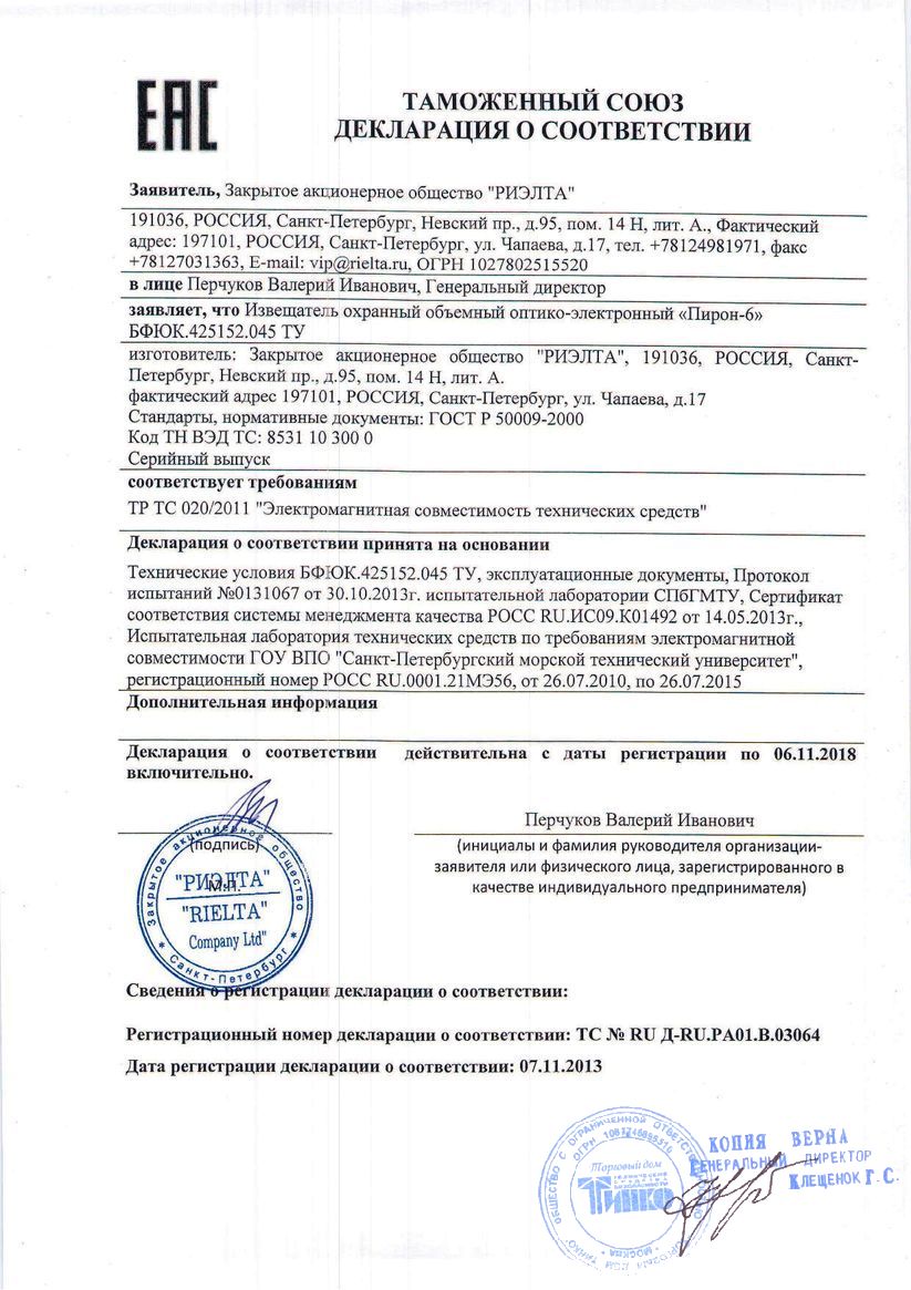 Извещатель охранный объемный оптико-электронный "Пирон-6" предназначен для обнаружения проникновения в охраняемое помещение и выдачи извещения о тревоге путем размыкания контактов реле.