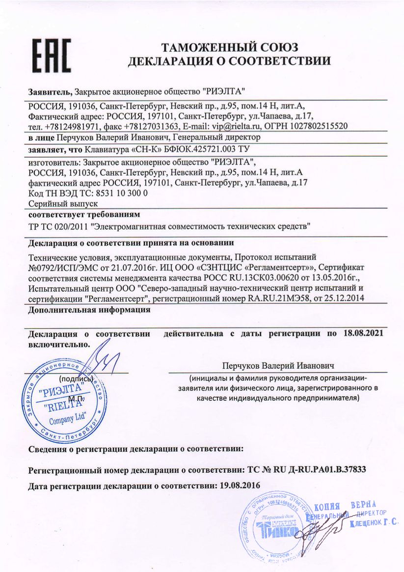 - индустриальные радиопомехи, создаваемые клавиатурой, соответствуют нормам для технических средств, применяемых в жилых, коммерческих зонах и производственных зонах с малым энергопотреблением по ГОСТ Р 50009-2000.