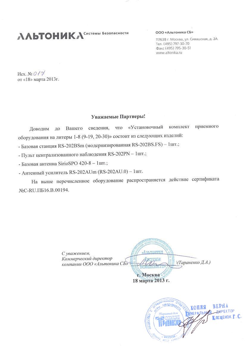 Установочный комплект приемного оборудования: Базовая станция RS-202BSm.03, RS-202AUm, Антенна SIRIO SPO 420-8, RS-202PN, Кабель соединительный
