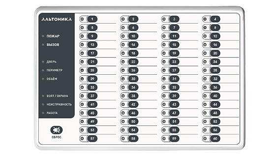 - кол-во светодиодных индикаторов контроля зон и устройств 60