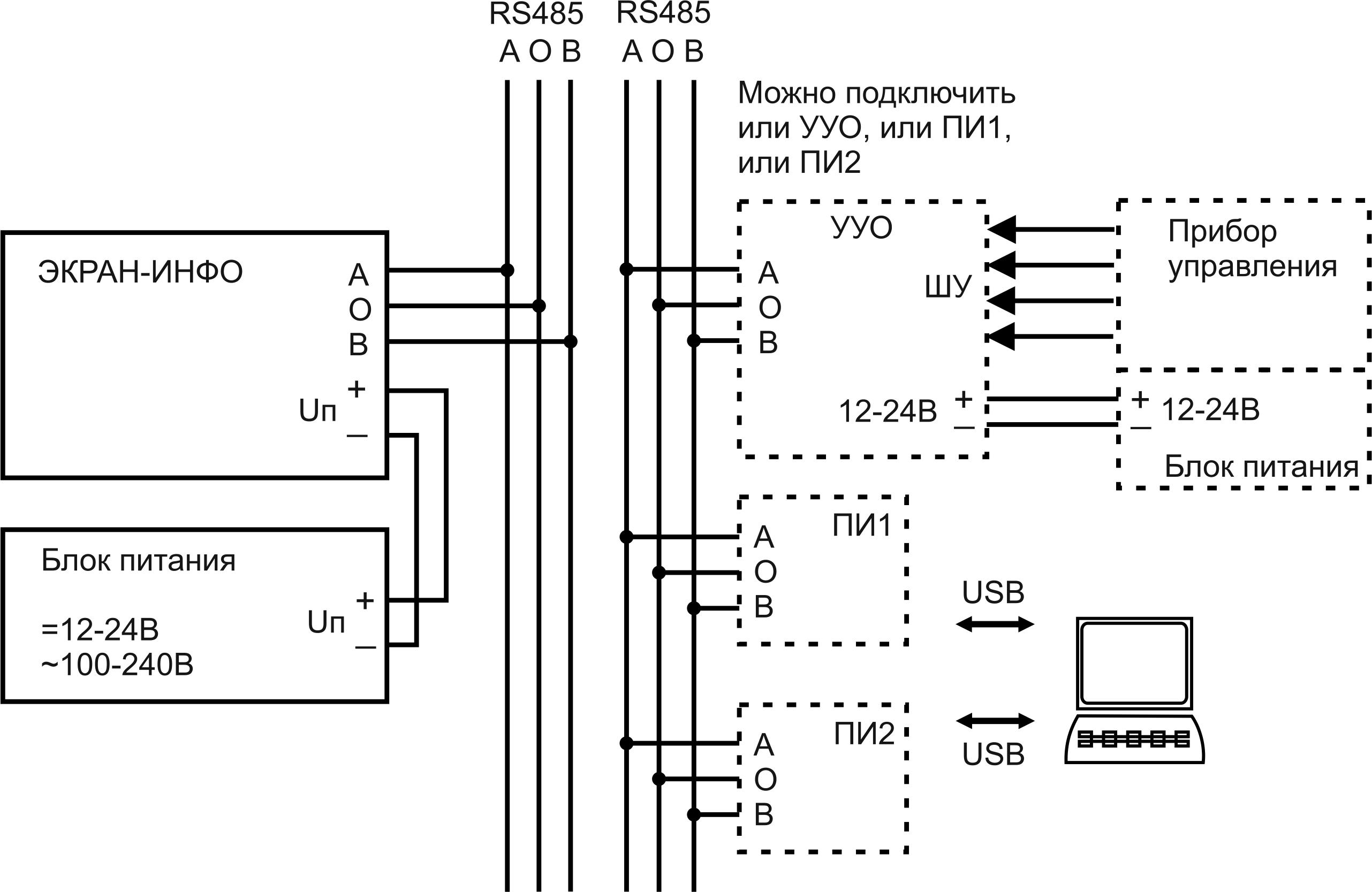 Связь с оповещателем осуществляется по интерфейсу RS-485 с гальванической развязкой и контролем линии связи. Максимальная длина линии связи 1 км. При потере связи между оповещателем и УУО, последний формирует на входах управления сигнал о неисправности, распознаваемый прибором управления (пультом).