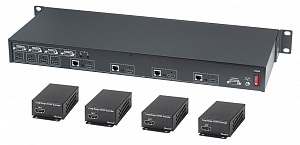 Матричный коммутатор HDMI 1.4 и ИК сигнала (4 входа/4 выхода) с передачей по кабелю витой пары на удалённый приёмник; Расстояние передачи до 100 м (CAT5e, 1080p) (HDBase-T). Поддерживает 3D; Вх.-4HDMI(тип А), вых.-4HDMI(тип А)/4RJ45. В комплект входит 4 приёмника по витой паре HE02ER; DC 12В / 4000мА(в комплекте), DC 5В / 2000мА.( БП 4 шт в комплекте );  -40°...+55°C.; Матричный коммутатор 483х88.4х220мм, Приемник 49x25x92.3мм