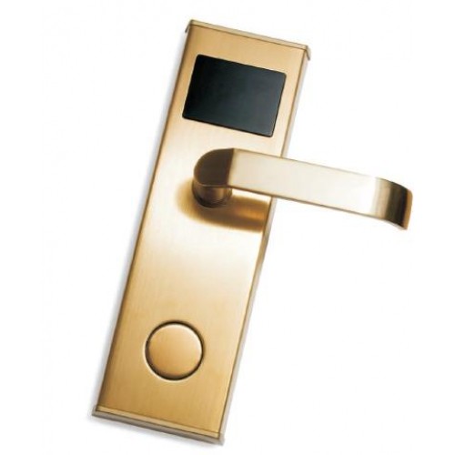 Врезной замок со встроенным контроллером (1364 польз.) и считывателем карт EM-Marine и HID (дальность 2-4см), питание 4х1,5В батарея АА (25тыс. открываний), режимы "Офис", "Отель". Звуковая/световая индикация работы, подключение внешней кнопки открывания двери, цвет золото.