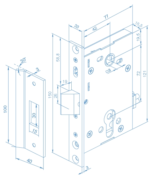 Замок может устанавливаться на деревянные и каркасные неметаллические двери толщиной от 38 до 50 мм, правого и левого открывания.
