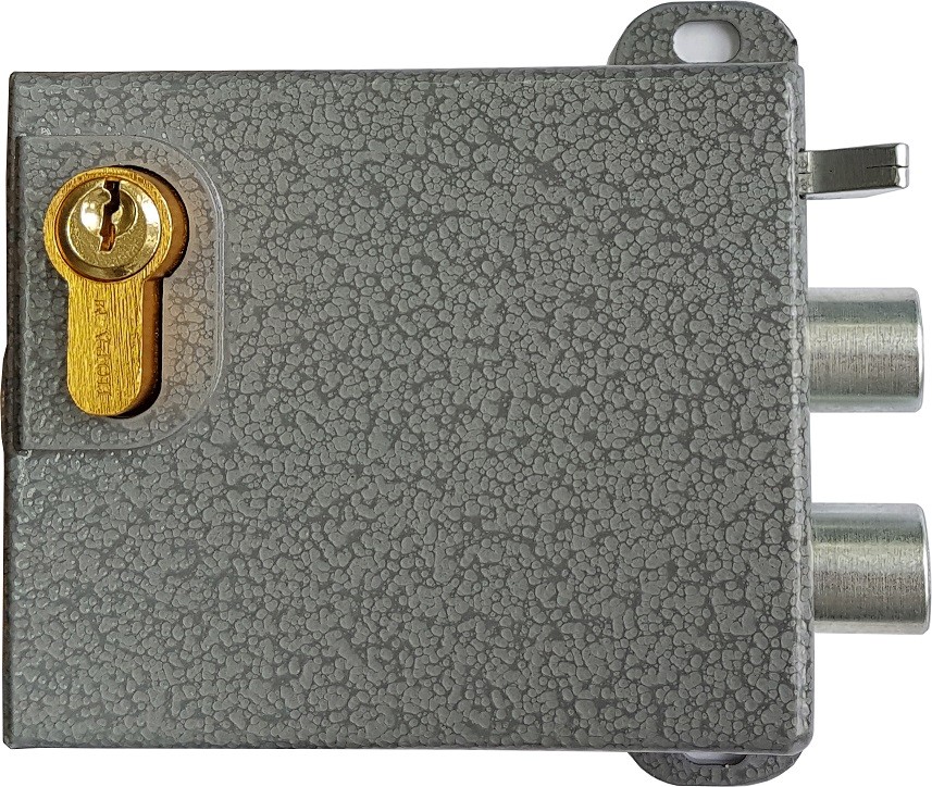 Накладной, универсальный. Снаружи и изнутри открывается ключом. Два засова. Переворот взводного кулачка. Задержка выхода засовов при взводе кулачка