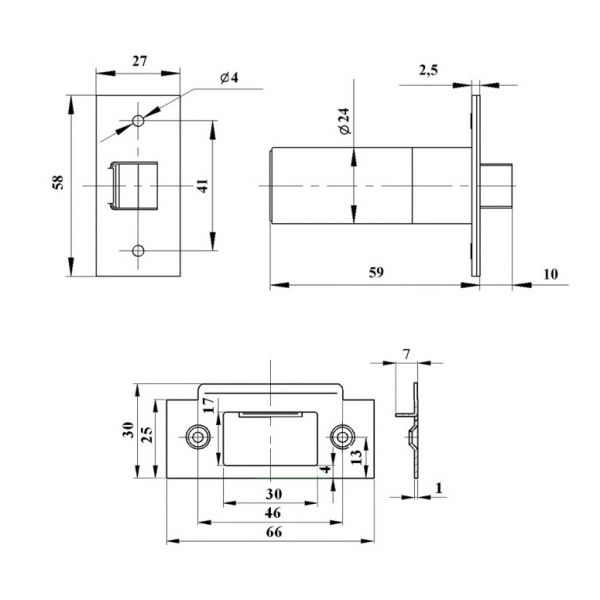 Врезной миниатюрный универсальный, усилие удержания 300кг, DC 9-14В/200мА, 24х63мм, нормально закрытый