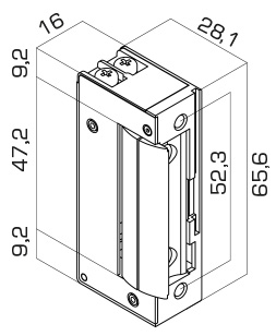 Электрозащелка, миниатюрная, стандартная, симметричная, разблокировка, 8-12 В AC/DC, 0,5-1,0 А, 28,1х16х65,6 мм, без планки